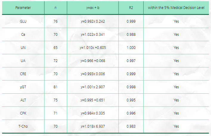 1. Á¤È®µµ´Â ±âº» Fuji Dri ChemÀº Àϰü¼ºÀÖ´Â Á¤È®¼ºÀ» ±ÔÄ¢ÀûÀ¸·Î Å×½ºÆ®ÇÕ´Ï´Ù. ¾Æ·¡ÀÇ Á¦½ÃµÈ µ¥ÀÌÅÍ´Â µµÄì´ëÇк´¿ø Àӻ󿬱¸¼Ò¿¡¼ ½Ã°Ô¿À ¿ÀÄíµµ ±³¼öÆÀÀÌ °øµ¿¿¬±¸ ÇÑ °ÍÀ¸·Î ȯÀÚÀÇ Ç÷û »ùÇÃÀ» ½À½ÄÀåºñ Hitachi 7180°ú Fuji Dri Chem Àåºñ·Î ºñ±³ºÐ¼® ÇÏ¿´½À´Ï´Ù. GLU, Ca, UN, UA, CRE, ¥ãGT, ALT, CK, T-Cho ÃÑ 9°³ÀÇ Ç׸ñÀ» Æò°¡ÇÏ¿´À¸¸ç 9Ç׸ñ ¸ðµÎ ³ôÀº Àϰü¼º°ú Á¤È®µµ¸¦ È®ÀÎÇÏ¿´½À´Ï´Ù.